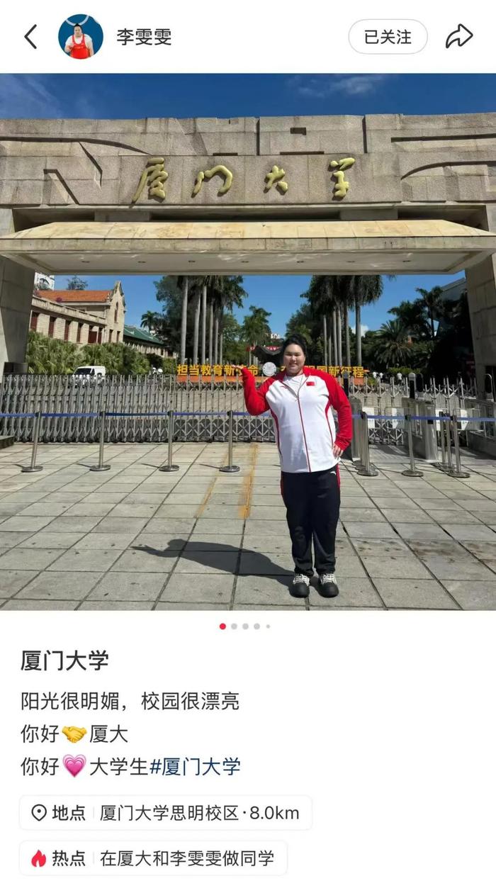 她表示:“这是我第二次来到厦大,不是作为奥运冠军,而是厦门大学2025级本科新生。”