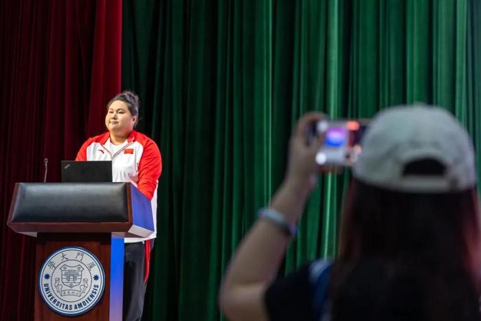 面对着“同级”的数千名同学,李雯雯回首自己的举重故事。她说,当她为了举起更多的重量不断拼搏时,世界上也有相同一群人在为相同目标不懈努力。无论来自何方,无论何种国籍,大家都不约而同地在拼搏中坚持“自强不息”的信念,不断突破自身的局限;在实践中追求“止于至善”的目标,毫不松懈地精进体育技艺。这恰好与厦大校训精神不谋而合。