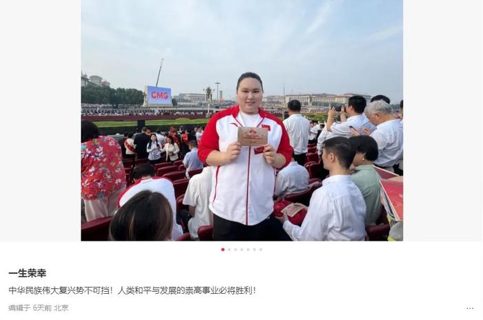 作为为国争光的奥运健儿,9月3日,李雯雯受邀至天安门现场观礼阅兵仪式,让她深有感触:“那一刻我觉得,我的辛苦都不算什么,真正辛苦的是军人们,是他们在默默付出和守护,才有了我们现在的和平与幸福。”李雯雯说:“我希望以后能有更多的机会,为厦大、为福建、为祖国争取更多的荣誉!”
