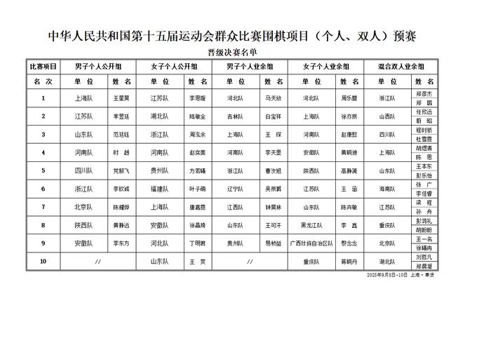 人民网北京9月11日电 (记者李乃妍)9月10日晚,经过三天八轮的角逐,第十五届全国运动会群众比赛围棋项目(个人、双人)预赛在上海市奉贤区闭幕。共有6位世界冠军领衔晋级决赛阶段赛事。上海队王星昊,江苏队李思璇,河北队马天放,河北队周乐萱,浙江队郑彦杰、郑璐分获各组冠军。